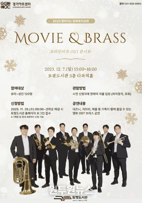 (원투원뉴스) 구리시 토평도서관은 OST 콘서트 'Movie & Brass'의 무료 관람 사전 신청을 11월 26일 오전 9시부터 구리시립도서관 홈페이지를 통해 선착순으로 신청받는다고 밝혔다. 관람 정원은 유아부터 성인까지 총 120명이다.