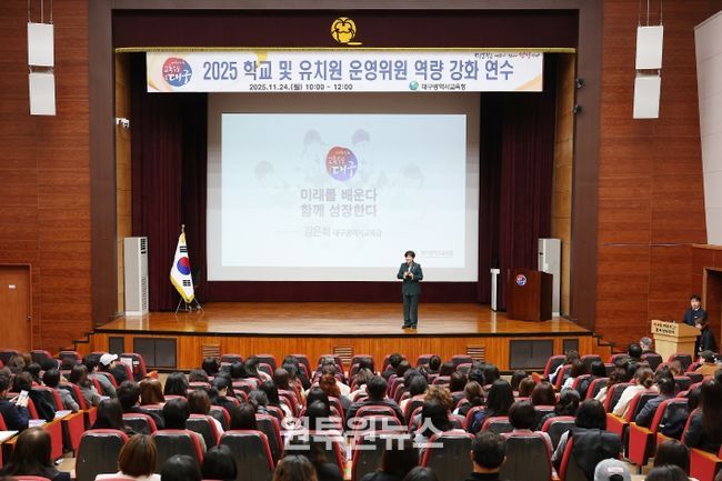 연수는 대구미래교육역량에 대한 강은희 교육감의 강의와 학교운영위원의 역할에 대한 전문가 강의를 통해 각 학교의 실정과 특색에 맞는 창의적인 교육 기반의 토대를 다지고, 학교운영위원의 전문성을 높이고자 마련됐다.