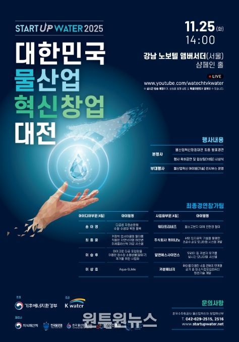 (원투원뉴스) 기후에너지환경부와 한국수자원공사는 물산업을 우리나라의 새로운 성장동력으로 성장시킬 ‘혁신형 고성장 기업(유니콘)’을 발굴하기 위해 11월 25일 노보텔앰버서더호텔(서울 강남구 소재)에서 ‘대한민국 물산업 혁신 창업대전 2025’ 최종 경연을 개최한다고 밝혔다.