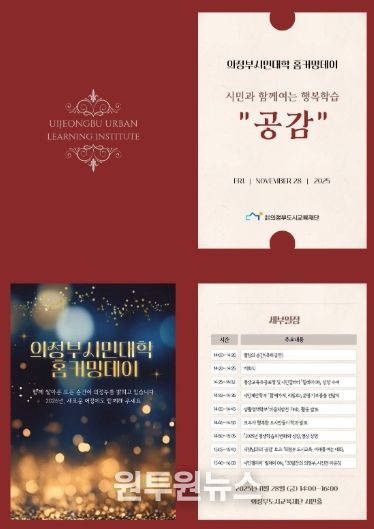 (원투원뉴스) (재)의정부도시교육재단은 오는 11월 28일 의정부도시교육재단 시민홀에서 ‘2025 의정부시민대학 홈커밍데이 공감’ 행사를 개최한다고 밝혔다. 이번 행사는 한 해 동안 시민이 참여한 다양한 학습 활동과 실천 사례를 공유하고, 시민대학의 성과를 시민과 함께 돌아보기 위해 마련됐다.