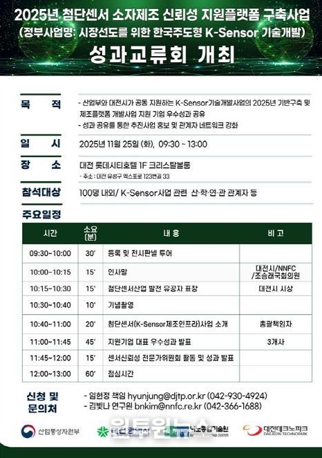(원투원뉴스) 대전시는 25일 유성구 롯데시티호텔에서 나노종합기술원, 대전테크노파크와 함께 ‘첨단센서 소자 제조‧신뢰성 지원 플랫폼 구축사업(K-Sensor)’ 성과교류회를 개최했다.