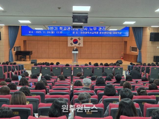 (원투원뉴스) 인천광역시교육청은 24일 정보센터 4층 대회의실에서 공립 각급학교 행정실장 500여 명을 대상으로 ‘2025년도 하반기 학교관리자 인사‧노무 관리 연수’를 실시했다.
