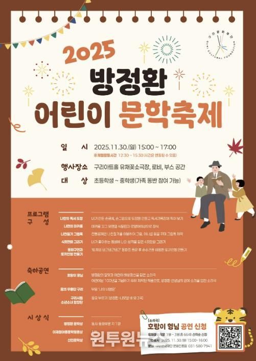 (원투원뉴스) 구리문화재단은 소파 방정환 선생의 아동 존중 정신을 기리고, 어린이들이 문학을 쉽고 즐겁게 접할 수 있는 '2025 방정환 어린이 문학 축제'를 오는 11월 30일 구리아트홀에서 개최한다고 밝혔다.