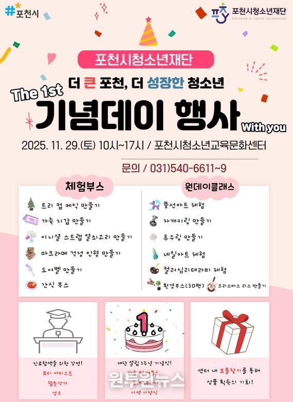 (원투원뉴스) 포천시청소년재단은 재단 출범 1주년을 맞아 오는 29일 포천시청소년교육문화센터에서 ‘2025년 포천시청소년재단 1주년 기념행사 – 더 큰 포천, 더 성장한 청소년’을 개최한다.