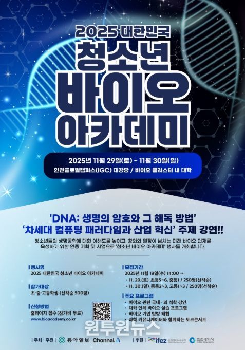 (원투원뉴스) 인천경제자유구역청은 29일부터 30일까지 양일간 대한민국의 바이오 분야 꿈나무들을 위한 ‘2025 대한민국 청소년 바이오 아카데미’를 개최한다고 밝혔다.