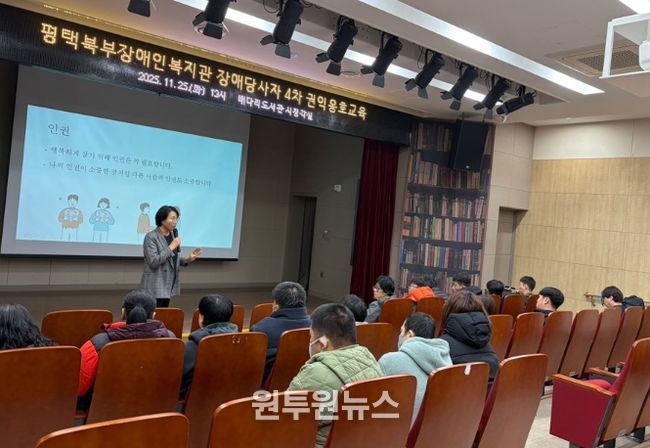 (원투원뉴스) 평택북부장애인복지관(관장 유영애)은 11월 25일, 배다리도서관에서 관내 3개 기관의 장애 당사자들을 대상으로 '2025 장애당사자 제4차 권익옹호교육'을 실시하며, 금년도 계획된 권익옹호교육 일정을 모두 마무리했다.