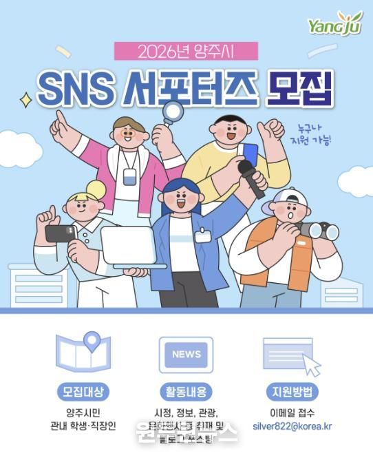 (원투원뉴스) 양주시가 시민과 소통하며 시정 소식과 지역의 숨은 매력을 널리 알릴 '2026년 양주시 SNS 서포터즈'를 오는 12월 1일부터 10일까지 10일간 모집한다.