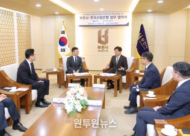(원투원뉴스) 부천시와 한국산업은행은 27일 오전 11시 부천시청 만남실에서 ‘부천대장 도시첨단산업단지 중심 수도권 서부 산업 생태계 조성 협력 업무협약’을 체결했다. 협약식에는 조용익 부천시장과 박상진 한국산업은행 회장을 비롯한 관계자들이 참석했다.