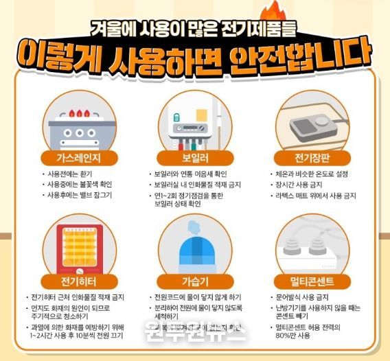 겨울철에는 전기제품 사용량이 늘면서 멀티탭 과부하 사고가 반복되는 만큼 전기 안전도 함께 챙겨야 한다. 파주소방서는 하나의 멀티탭에 여러 기기를 꽂아 사용하는 문어발식 사용을 피하고, 난방기처럼 소비전력이 큰 제품은 단독 콘센트에 연결해 줄 것을 권했다. 플러그 주변에서 타는 냄새가 나거나 색이 변한 흔적이 보인다면 바로 교체해달라는 안내도 덧붙였다.
