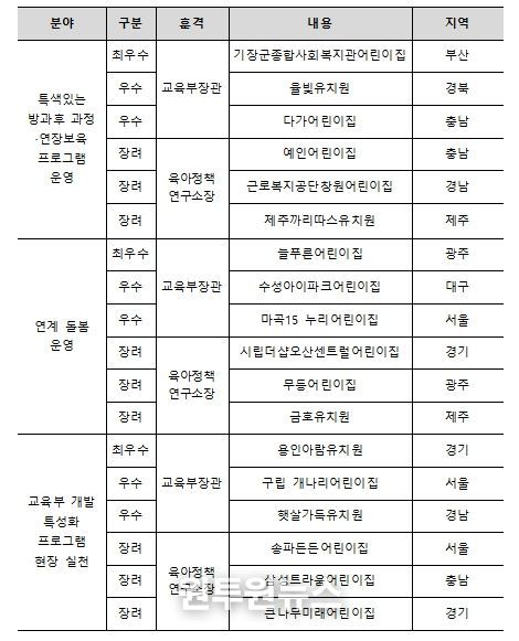 수상작은 각 분야별로 최우수상 1편(교육부장관상), 우수상 2편(교육부장관상), 장려상 3편(육아정책연구소장상)이 선정됐다. 이번 공모전에서는 지역 여건과 기관 특성을 반영하여 기획·운영한 맞춤형 프로그램이 우수사례로 평가받았다.