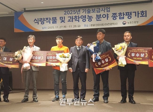(원투원뉴스) 김포시농업기술센터는 지난 11월 27일, 대전광역시 유성구 호텔 인터시티에서 열린 농촌진흥청의 ‘2025년 식량작물 및 과학영농분야 기술보급사업 종합평가회’에서 식량작물 기술보급 활성화 우수사례 경진 최우수 기관상을 수상했다.