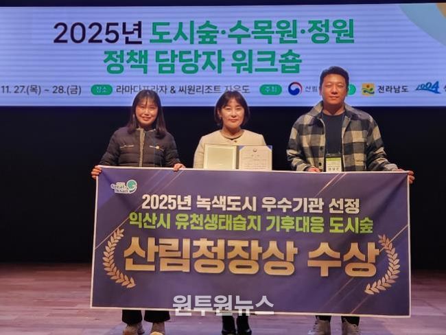 익산시는 산림청 주관 '2025년 녹색도시 우수사례-기후대응도시숲 분야'에서 유천생태습지 기후대응도시숲의 우수성을 인정받아 산림청장상을 받았다.