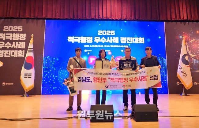 (원투원뉴스) 경남도가 지난 27일 열린 행정안전부 ‘2025년 적극행정 우수사례 경진대회’에서 ‘적극행정으로 국제중재 첫 승소, 138억 절감 도민에게 돌려줘’ 사례로 기관 표창(인사혁신처장상)을 받았다고 28일 밝혔다.