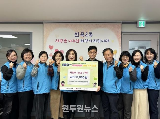 (원투원뉴스) 의정부시 신곡2동주민센터는 11월 27일 신곡2동 지역사회보장협의체가 관내 취약계층을 위해 ‘100일간 사랑릴레이 배턴 잇기’에 성금 50만 원을 기탁했다고 밝혔다.