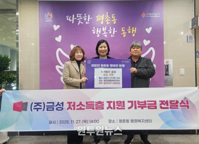 (원투원뉴스) 안양시 동안구 평촌동 행정복지센터는 관내 건설자재 제조업체인 ㈜금성이 지난 27일 관내 어려운 이웃을 위해 사용해달라며 성금 1천만원을 센터에 기탁했다고 28일 밝혔다.