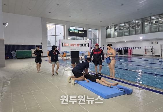 훈련에는 수영장 관리책임자, 수상안전요원, 스포츠강사등이 참여해 익수자 구조, 심폐소생술(CPR), 자동심장충격기(AED) 사용법, 119 신고 및 현장 상황 통제 등 실제 상황을 가정해 강습 중 시민들이 지켜보는 가운데 모의훈련을 진행했다.
