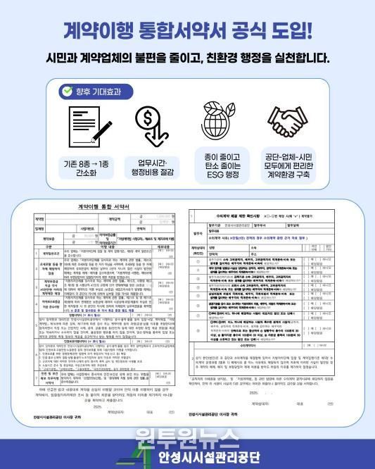 (원투원뉴스) 안성시시설관리공단은 계약 절차 간소화와 행정효율성 강화를 위해 '계약이행통합서약서'를 공식 도입·시행한다고 밝혔다.
