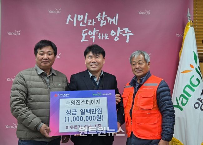 (원투원뉴스) ㈜영진스테이지는 지난 27일 양주시 남면행정복지센터를 방문해 지역 내 어려운 이웃을 위한 이웃돕기 성금 100만 원을 전달했다.