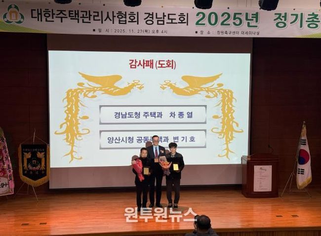 (원투원뉴스) 대한주택관리사협회 경남도회는 어제(11월 27일) 창원축구센터 대세미나실에서 2025년 정기총회를 열고 공동주택 관리 발전에 기여한 공로로 경상남도 및 양산시, 올해 우수 주택관리사와 공로자 등 20여명에 대해 표창 및 감사패를 수여했다.