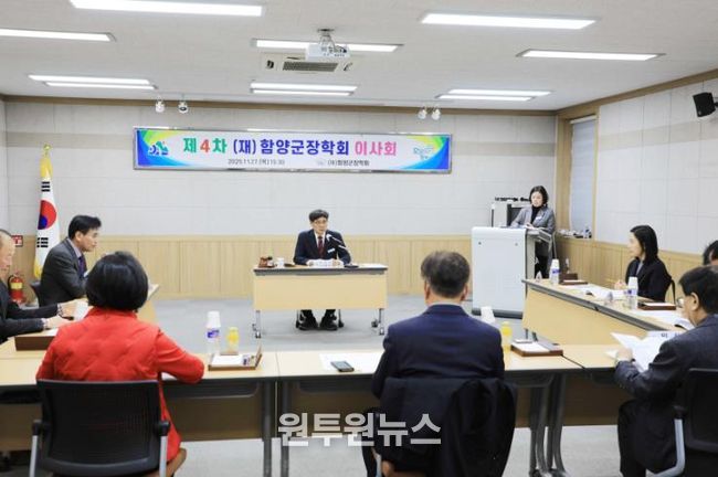 이날 이사회에는 진병영 이사장을 비롯한 이사·감사 등 8명이 참석했으며, 2025년 다자녀 가정 장학생 선발과 (재)함양군장학회 2026년 사업계획 및 세입세출예산 편성에 대해 심의 의결했다.