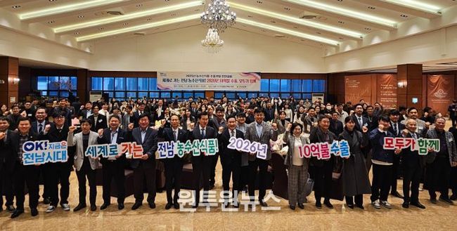 (원투원뉴스) 전라남도는 28일 남악 스카이웨딩컨벤션에서 농수산 수출기업, 수출 유관기관 등 200여 명이 참석한 가운데 ‘2025 농수산식품 수출기업 전진대회’를 열어 2026년 수출 10억 달러 달성 결의를 다졌다.