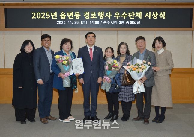 (원투원뉴스) 충주시는 28일, 충주시청 3층 중회의실에서‘2025년 읍면동 경로행사 우수단체 시상식’을 개최하며 지역사회 경로효친 문화 확산과 어르신 복지 증진에 기여한 8개 우수단체를 표창했다.