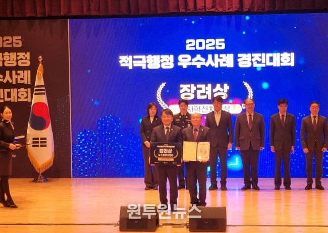(원투원뉴스) 충북도는 27일 정부세종청사에서 개최한 ‘2025년 적극행정 우수 사례 경진대회’에서 토지정보과의 ‘도로급경사지 위치정보 부여 재난 대응 골든타임 확보’ 사례로 인사혁신처장상(장려상)을 수상했다고 밝혔다.