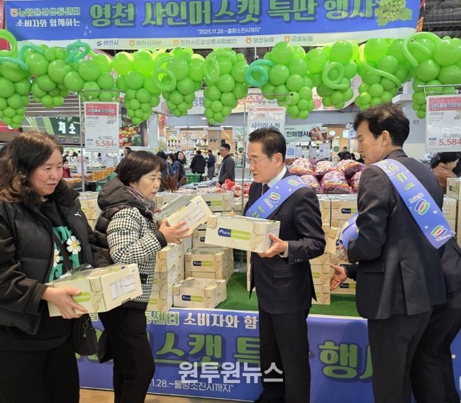 시는 샤인머스캣 과잉 공급에 대응하고 지역 농산물 소비 촉진 및 농업 상생 문화 확산을 위해, 지난 9월 전국 하나로마트에서 샤인머스캣 30톤을 완판한 데 이어 10월에는 전국 롯데마트·롯데슈퍼 328개 지점과 이마트 132개 지점에서 진행한 영천포도 축제에서도 준비 물량 207톤을 모두 판매하는 성과를 거뒀다.