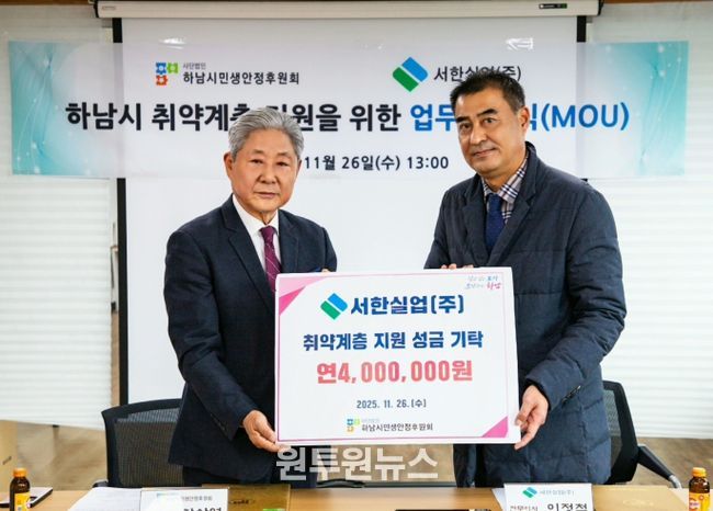 (원투원뉴스) 서한실업(주)와 하남시민생안정후원회는 11월26일 하남시 취약계층 지원을 위한 업무협약을 체결했다. 이번 협약을 통해 서한실업(주)는 연간 400만원 기탁하며 하남시의 이웃들을 위한 꾸준한 나눔 활동을 이어가기로 뜻을 모았다.