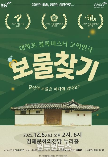 (원투원뉴스) (재)김해문화관광재단 김해문화의전당은 가족 간의 갈등과 치유 및 화해를 유쾌하게 풀어낸 블록버스터 휴먼 코미디 연극 '보물찾기'를 오는 6일 오후 2시, 6시 누리홀에서 선보인다.