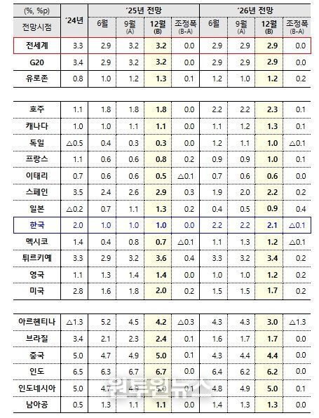 세계경제 성장 하방 위험요인으로 ➊무역정책의 추가적인 변화, ➋인플레이션 압력 재부상, ➌자산 가격의 급격한 조정에 따른 금융시장 위험 확대, ➍재정건전성 악화에 따른 금융 여건 위축 등을 제시했다. 상방 요인으로는 ➊무역장벽 완화(reversal of the increase in trade barriers), ➋지정학적 불확실성 감소, ➌인공지능(AI) 관련 투자를 통한 생산성 증가 등을 언급했다.
