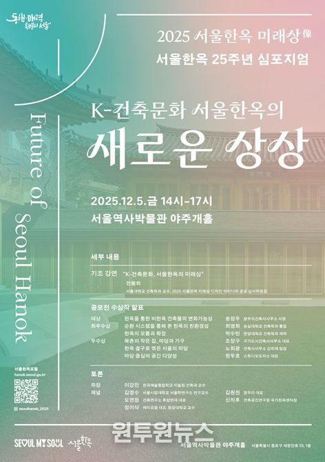 (원투원뉴스) 서울시가 한옥 정책 25주년을 맞아 ‘한옥의 새로운 상상’을 함께 공유하는 심포지엄을 연다. 12월 5일 오후 2시 서울역사박물관 야주개홀에서 열리는 이번 행사는 전문가와 시민 누구나 참여할 수 있다.