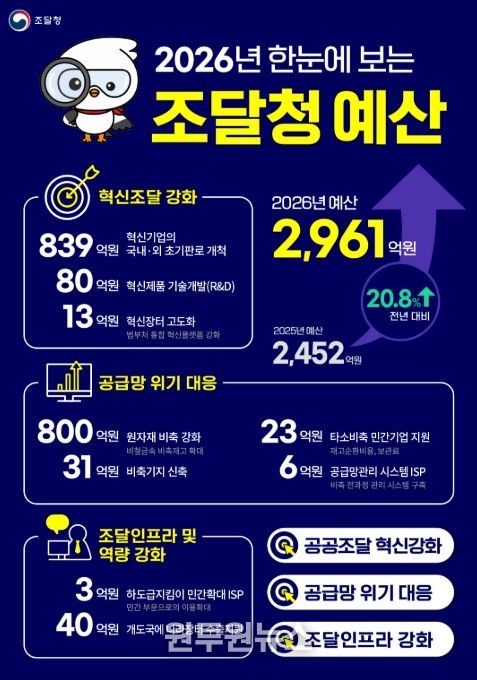 (원투원뉴스) 조달청은 12월 2일 국회 본회의 의결을 통해 2026년도 예산을 올해 대비 20.8% 증가한 역대 최대규모인 2,961억원으로 확정했다고 밝혔다.