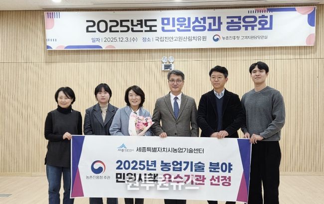 (원투원뉴스) 세종특별자치시 농업기술센터가 3일 농촌진흥청에서 주관하는 ‘2025년 농업기술분야 민원시책 우수기관’에 선정돼 농촌진흥청장 표창을 받았다고 밝혔다.