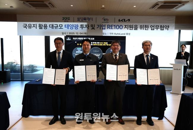 (원투원뉴스) 경기도와 화성특례시, 기아, 한국자산관리공사는 4일 기아오토랜드 화성에서 태양광 발전사업 추진과 RE100 이행 지원을 위한 업무협약을 체결했다.