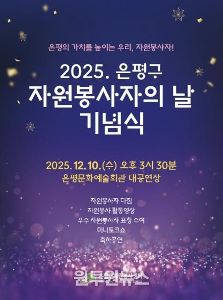 (원투원뉴스) 서울 은평구는 오는 10일 은평문화예술회관 대공연장에서 ‘2025 자원봉사자의 날 기념식’을 개최한다고 밝혔다.