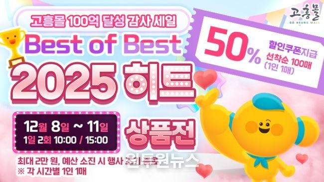(원투원뉴스) 고흥군은 직영 온라인 농수축특산물 쇼핑몰 ‘고흥몰’이 누적 매출 100억 원 돌파를 기념해 오는 1월 8일부터 11일까지 ‘100억 달성 감사 세일–2025 Best of Best’ 기획전을 진행한다고 밝혔다.