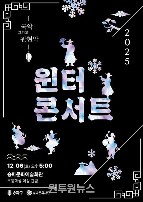 서강석 송파구청장은 “멋진 장소에서 사랑하는 사람들과 다채로운 공연을 감상하며, 즐겁고 따스한 연말 보내시길 바란다”라며, “새해에도 송파문화예술회관을 중심으로 구민의 문화 향유 기회를 확대하기 위해 최선을 다할 것”이라고 전했다.