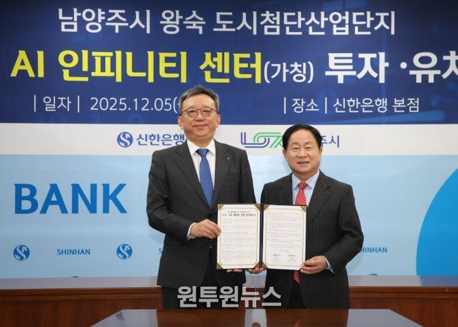 (원투원뉴스) 남양주시는 5일 서울 중구 신한은행 본점에서 신한금융그룹과 왕숙 도시첨단산업단지 내 ‘AI 인피니티 센터’ 투자유치를 위한 업무협약을 체결했다.