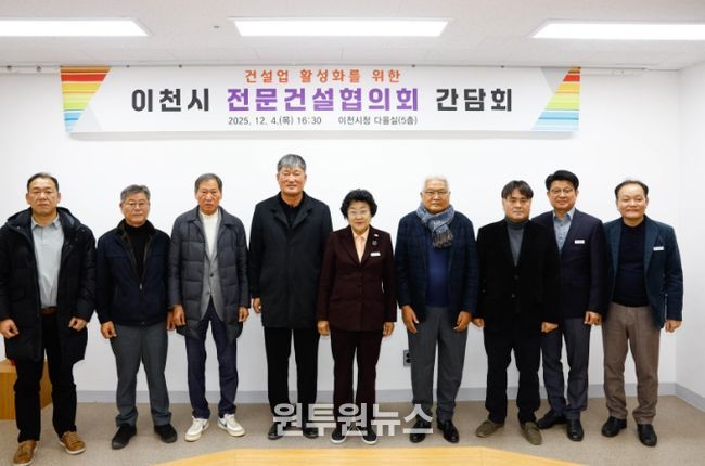(원투원뉴스) 이천시는 12월 4일 시청 다올실에서 전문건설협회와 간담회를 열고 지역 건설산업과 관련한 현장의 의견을 청취하는 자리를 마련했다. 이번 간담회에는 김경희 이천시장과 김종구 전문건설협회장을 비롯한 협회 임원 등 총 9명이 참석했다.