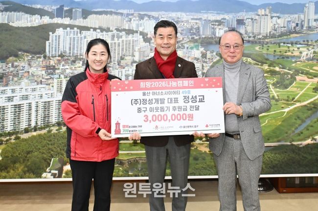 (원투원뉴스) ㈜정성개발(대표이사 정성교)이 12월 5일 오후 3시 30분 중구청 구청장실을 방문해 울산사회복지공동모금회를 통해 이웃돕기 후원금 300만 원을 전달했다.