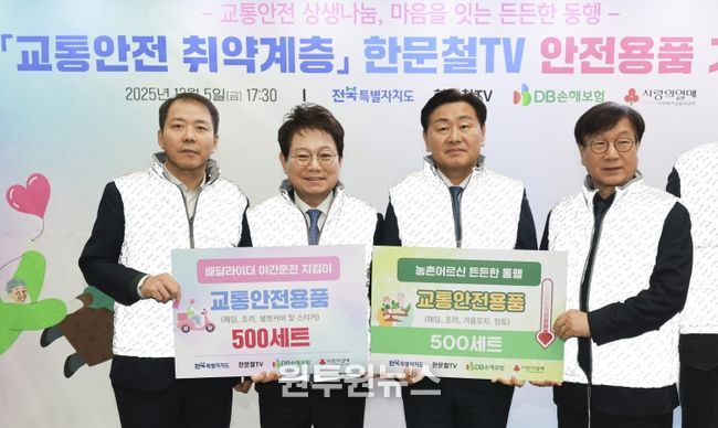 (원투원뉴스) 전북특별자치도가 5일 도청에서 한문철TV와 DB손해보험과 함께 교통안전 취약계층을 위한 안전물품 기탁식을 가졌다.