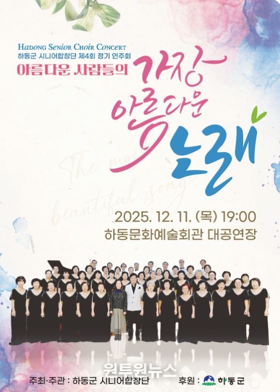 (원투원뉴스) 하동군시니어합창단(단장 강용기)이 오는 12월 11일 저녁 7시, 하동문화예술회관에서 ‘제4회 정기 연주회’를 개최한다. 깊어지는 겨울밤, 군민들에게 따뜻한 감동과 음악적 울림을 전하기 위해 준비된 연말 공연으로 많은 관심이 집중되고 있다.