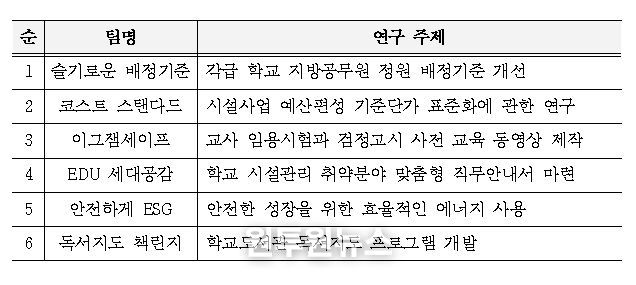 우수행정연구회로는 △각급 학교 지방공무원 정원 배정기준 개선(슬기로운 배정기준) △시설사업 예산편성 기준단가 표준화에 관한 연구(코스트 스탠다드) △교사 임용시험과 검정고시 사전 교육 동영상 제작(이그잼세이프) △학교 시설관리 취약분야 맞춤형 직무안내서 마련(EDU 세대공감) △안전한 성장을 위한 효율적인 에너지 사용(안전하게 ESG) △학교도서관 독서지도 프로그램 개발(독서지도 책린지) 등 6팀이 선정됐다.