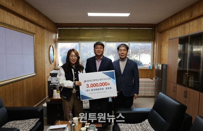 (원투원뉴스) 2025년 12월 5일, 삼천포고등학교(교장 서영희)는 한국정화건설(주)(대표 정영춘)로부터 발전기금을 전달받았다. 삼천포고 30회 졸업생인 정영춘 대표는 기업 성장의 보람을 지역 사회에 환원하고자 하는 취지로 모교에 꾸준한 지원을 약속했다.