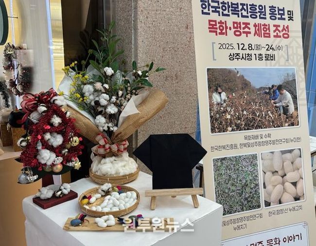 (원투원뉴스) 한국한복진흥원 입주기업 누미한은 12월 8일부터 12월 24일까지 진흥원 내 목화밭에서 재배한 목화솜과 명주천을 활용한 체험형 전시를 상주시청 로비에서 진행한다.