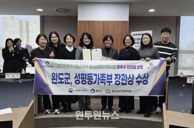 (원투원뉴스) 완도군이 '2025년 인구 감소 지역 청소년 성장 지원 사업' 시행 첫해 최우수 지자체로 선정되어 성평등가족부 장관상을 수상했다.