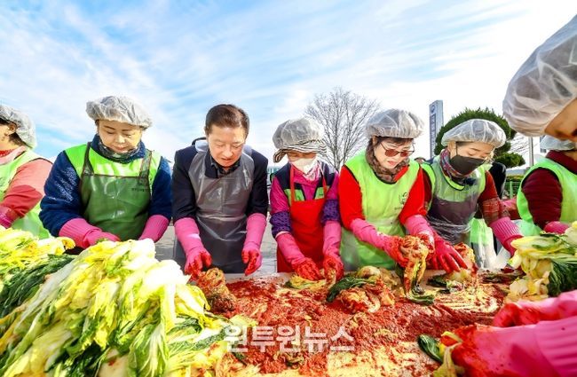 이번 사업은 군 보조금과 함안시니어클럽(관장 안복실)에서 후원한 배추 400포기, 무 200개를 바탕으로 진행됐으며, 함안군여성단체협의회(회장 양영희) 회원 40여 명이 약 1100포기의 김치를 정성껏 담그며 이웃 사랑을 실천했다.