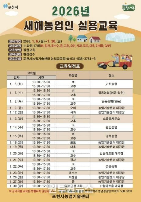 (원투원뉴스) 포천시는 오는 1월 6일부터 30일까지 지역 농업인의 영농기술 향상과 농업 경쟁력 강화를 위해 ‘2026년 새해농업인 실용교육’을 추진한다.