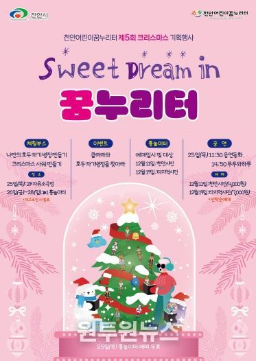 (원투원뉴스) 천안어린이꿈누리터(관장 조삼혁)는 오는 12월 25일부터 28일까지 제5회 크리스마스 기획행사‘Sweet Dream in 꿈누리터’를 진행한다고 밝혔다.